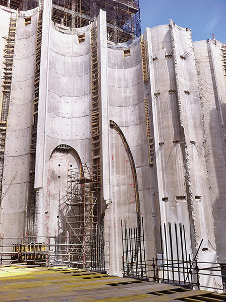 Velkou výzvou pro realizátory proměny objektu byly mohutné plochy pohledových betonů. Původní tloušťka betonových stěn byla jen 17 centimetrů, což pro stabilitu objektu po odstranění vnitřních přepážek nestačilo. Proto nechali architekti původní stěny dodatečně zesílit novou, 42 cm silnou vrstvou betonu. Po sejmutí bednění se objevila celá řada nedostatků a poruch, na některých místech došlo k vyplavení cementové kaše a ke vzniku štěrkových hnízd, vznikly nežádoucí odskoky v betonu, povrchy nesourodě odrážely světlo a byly na mnoha místech znečištěny zbytky olejů.