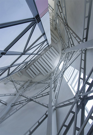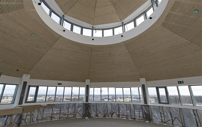 Mezi vstupní halou a prvním patrem byl vytvořen osmnáctimetrový dřík, komunikační jádro z ocelové konstrukce a sádrokartonových příček zakončené podhledem z akustických děrovaných desek Knauf CLEANEO. Pod ním jsou zavěšeny na závitových tyčích a řetízcích sálavé panely pro vytápění. Uprostřed jádra je schodiště a výtahová šachta, kde jsou na obou protilehlých stranách vytvořeny šachty pro vzduchotechniku, elektroinstalaci apod. Představuje to celkem tři požární úseky, které bylo nutné oddělit. Použitá konstrukce Knauf W112 je proto dvojitě opláštěna speciálními sádrokartonovými protipožárními deskami Knauf RED Piano. I vestavba v horní části věže je ze sádrokartonu. Díky prostoru, a především výšce, ve které se pracovalo, nebyla realizace snadná, protože většinu desek bylo nutné dostat nahoru na lešení ručně. Opláštění ocelových nosníků a podhledy zde plní spíše pohledovou funkci, ale i tak bylo nutné dodržet předepsanou požární odolnost REI 45 minut. V opláštění jsou opět použity protipožární desky Knauf RED Piano v tloušťce 15 mm, spáry jsou přelepeny skelnou páskou a vytmeleny Knauf Uniflott.