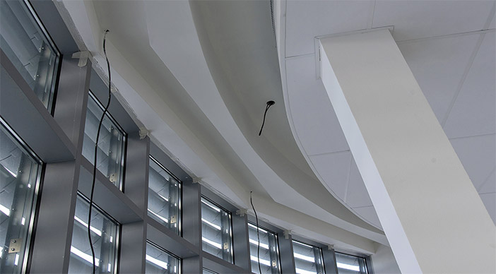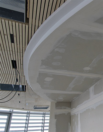 Některé detaily se doslova modelovaly po kouskách, aby do sebe vše přesně zapadlo. Zevnitř jsou sádrokartonové desky opatřeny parotěsnou membránou a tepelnou izolací. V pátém patře jsou všechny ocelové nosníky opláštěny konstrukcemi se sádrokartonovými deskami Knauf WHITE. Z půdorysu podlahy šestého patra je spuštěna předstěna, do které jsou vloženy anemostaty. V komunikačním centru je také hygienické zázemí objektu, kde byly použity impregnované desky Knauf GREEN. Do čtvrtého patra byly umístěny kanceláře. Znamenalo to rozdělit kulatý prostor příčkami Knauf W112 s dvojitým opláštěním sádrokartonem Knauf WHITE s izolací. Konstrukce příček byla v tomto případě z hlediska akustiky dostatečná vzhledem k tomu, že se v místnostech neočekává vyšší hladina hluku. Doplňuje je akustický podhled.
