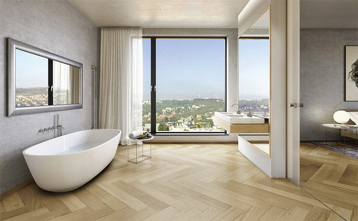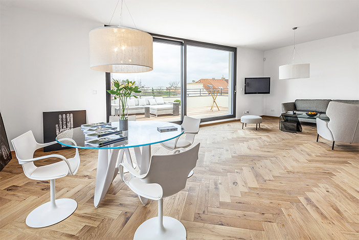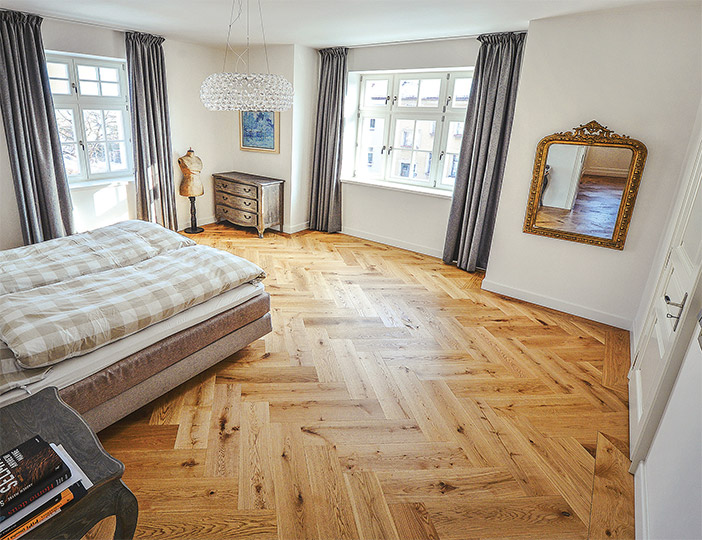 Moderní pojetí pokládky širokých dubových podlah ESCO do stromečku – tento styl pokládky je velkým aktuálním trendem a i u nás je v současné době čím dál tím oblíbenější.