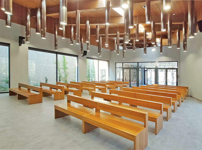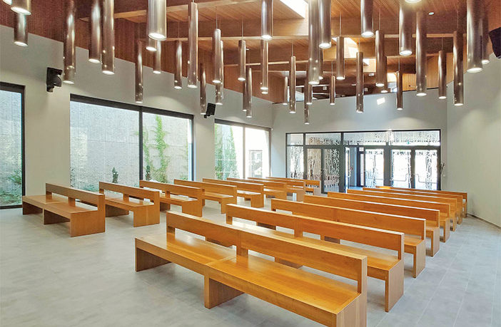 S imitací betonu na stěnách ladí keramická dlažba na podlahách v odstínu přírodního betonu. Naopak kontrastně působí dřevěné obklady z hoblovaných latí v odstínu americké třešně, které se objevují v částech místností, včetně hlavní obřadní síně.