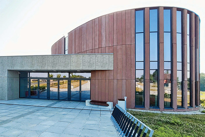 Fasáda si ponechává strohý a moderní výraz, který na sebe nepoutá nežádoucí pozornost. Je řešena jako provětrávaná, s obkladem ze sklovláknobetonových desek se strukturovaným povrchem. Zatímco nižší část objektu je laděna do tlumeného odstínu světle šedé (přírodní beton), vyšší část navrhli projektanti v rezavě červeném odstínu.
