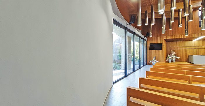 Šedá barva stěn tvoří důstojnou atmosféru smuteční síně v Havířově-Šumbarku. Pro její interiéry byly vybrány omítky imitující vzhled pohledového betonu od společnosti LB Cemix.