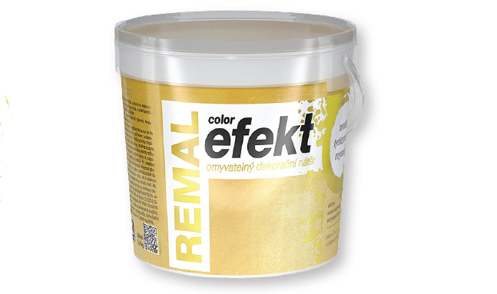Zlatý, stříbrný anebo perleťově stříbrný REMAL EFEKT je kořením, doplňkem každého designu. Použitím tohoto lesklého akrylátového nátěru propůjčíte každé stěně jedinečný punc luxusu. Navíc je barva plně omyvatelná, vhodná tedy i k dekoraci stěn namáhaných mechanicky – předsíň, kuchyň, chodba.