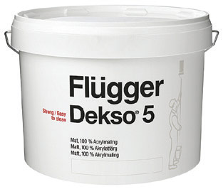 Flügger Dekso 5 je 100% akrylátová barva, která tvoří pěkný matný povrch. Je robustní, odpuzuje nečistoty a je vysoce omyvatelná. Vhodná pro úřady, kanceláře, obývací pokoje, kuchyně a zejména tam, kde jsou kladeny vysoké nároky na funkčnost a estetiku. Ideální je do prostor se zvýšenou vlhkostí, jako jsou koupelny, kuchyně atd.