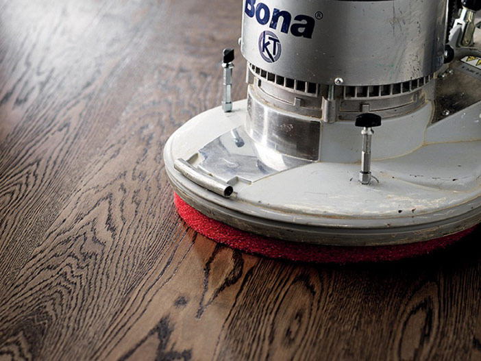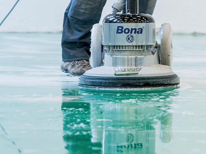Bona PowerScrubber vyčistěte a vysajte vodu z povrchu podlahy. Podlahu nechte přes noc zaschnout. Na závěr aplikujte jednu vrstvu transparentního laku.