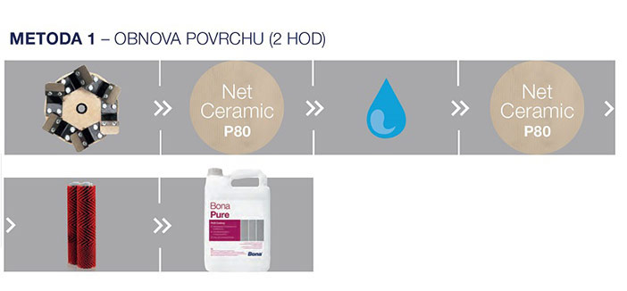 Pokud je možné podlahu renovovat, začněte s broušením na sucho pomocí Bona FlexiSand 1.9, s unašečem Bona PowerDrive Connect a disky Bona Diamond Blades. Použijte Bona Supraflex pro okraje a brusnou mřížku Bona Net P80. Poté přidejte vodu na podlahu a použijte Bona FlexiSand s unašečem Bona Quattro Disc a mřížku Bona Net Ceramic P80. Podlahu přebruste. Pomocí
