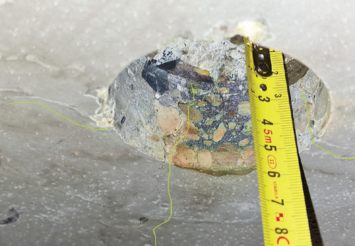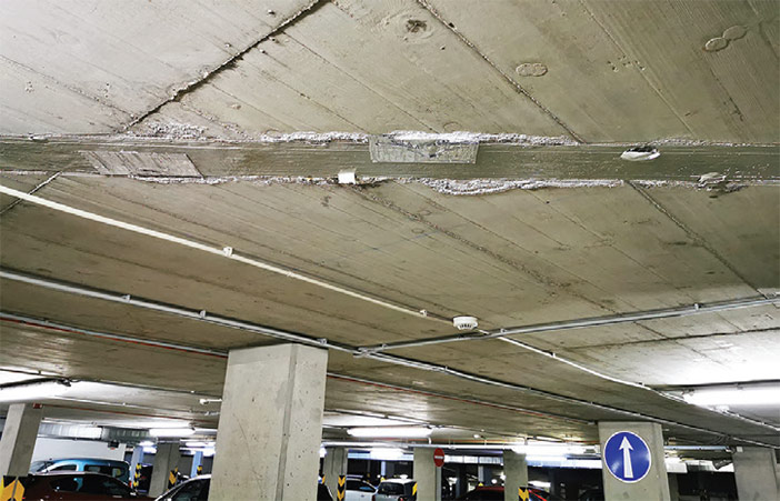Opačným prístupom je napríklad záujem o „preventívnu“ opravu, resp. výmenu nášľapnej vrstvy, pretože obsahuje nejaké trhlinky, ktorých šírky sú cca 0,1–0,2 mm, ojedinele 0,3 a výnimočne do 0,4 mm. Súhrnná plocha nášľapnej vrstvy nevykazovala žiadne iné defekty, len v blízkosti rámp bola užívaním zbrúsená až na ŽB dosku. Odhadovaná zostatková životnosť nášľapnej vrstvy bola cca 10–15 rokov. Pristúpilo sa preto k diagnostike podlahy garáží. Z prieskumu vyplynulo, že na celej ploche sa nenašlo ani jedno delaminované miesto. Citlivosť akustického trasovania pritom býva cca 1–2 cm2. Okrem toho sa zistilo, že výstuž v mieste trhlín nevykazuje žiadne známky korózie. Hĺbka karbonatizácie betónu v tejto oblasti je len niekoľko milimetrov. Prakticky nemerateľná in situ. Obsah chloridov v betóne v mieste trhlín a mimo nich bol prakticky rovnaký a výrazne nižší, ako je povolený limit 0,4 % pre betóny vystužené ŽB konštrukcie. Rovnako sa nepotvrdila ani obava o priesaky solí k spodnému povrchu ŽB dosky. V tomto prípade sa podarilo oddialiť zbytočný sanačný zásah v hodnote cca 200 000 eur o niekoľko rokov, a využiť tak zostatkovú životnosť nášľapnej vrstvy. Jedinou podmienkou je vykonať v horizonte 2 rokov kontrolu stavu výstuže a obsahu chloridov v najexponovanejšom mieste, čo reprezentuje náklad v rádovo niekoľko promile z hodnoty sanácie.