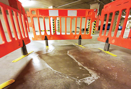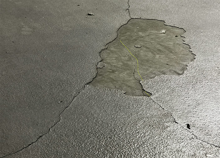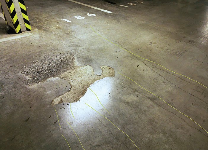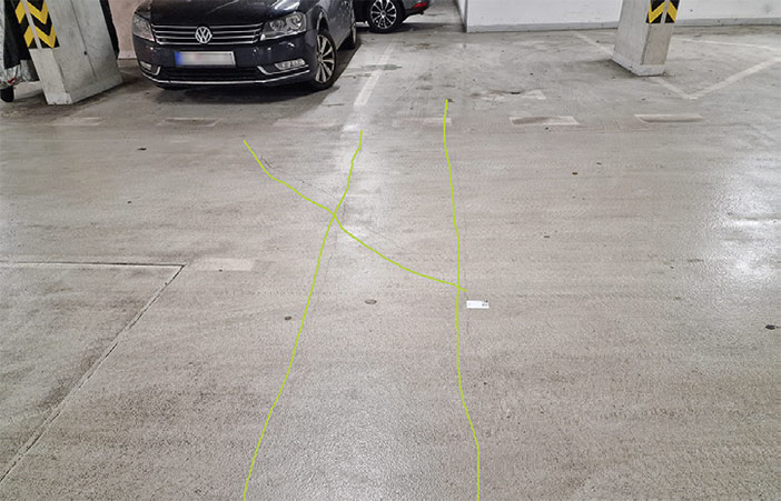 Obr. 3: Trhliny v podlahe garáží (polyfunkčný dom, Bratislava).