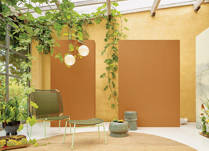 Další zajímavou barvu představil Caparol. Jedná se o medově zlatý odstín Amber (3D Honig-Gold Amber 65), který dodává prostoru hloubku, útulnost a vytváří hřejivý dojem. Zajímavostí je fakt, že jde stejně jako u WGSN a Pantone o jistou formu oranžové, v tomto případě více intenzivní, přesto tlumenou a do interiéru velice vhodnou. Je to odstín, který dokáže rozjasnit prostor, ale zároveň přináší teplo domova, navozuje svěží, bezpečnou, vzdušnou a uvolněnou atmosféru. Připomíná sluneční paprsek procházející podzimními listy, který na zem promítá svůj zlatý třpyt.